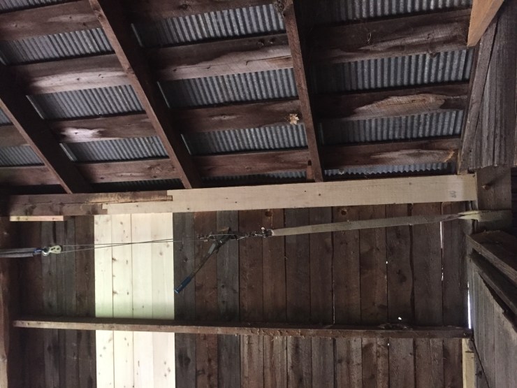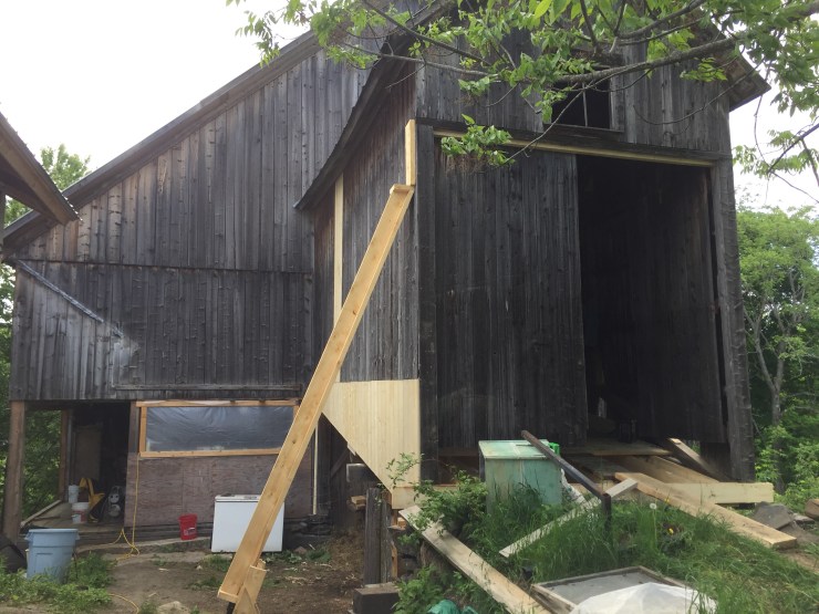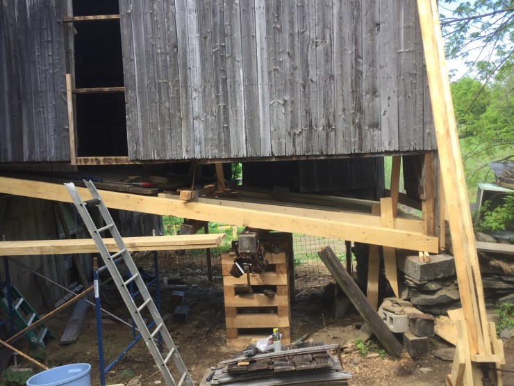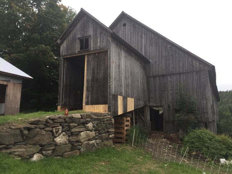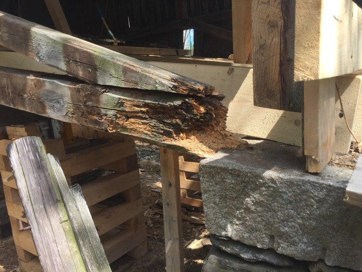 Due to settling of the Earthen ramp on which the drive lands, the building had sunk over eight inches, separating itself from the main barn in the process. Rot had crept into the sill and joists as a result of water damage from shifting eave lines. We reset the building and made the necessary repairs, while stone mason John Rodgers of Glover rebuilt the ramp approach with Granite, fieldstone and crushed stone.